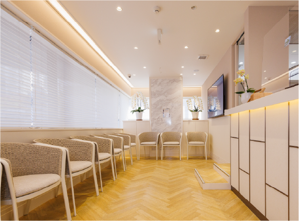 ご高齢の方やお子様連れの方にも快適にご来院いただけるよう、バリアフリー設計としています。白とグレーを基調とした清潔感のある空間です。